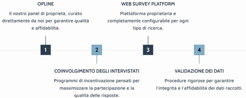 Crediamo che un buon lavoro di ricerca nasca dal controllo di tutte le componenti del processo: per questo lavoriamo attraverso un panel di proprietà – OpLine – di cui curiamo attentamente il coinvolgimento degli intervistati, il programma di incentivazione, la piattaforma di Web survey e le procedure di validazione dei dati raccolti.