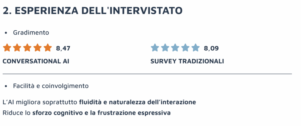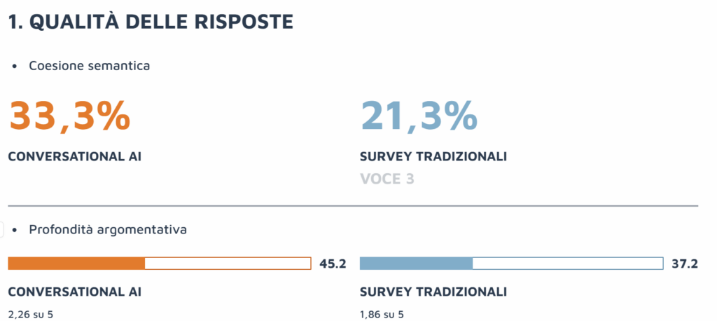 - Branch AI conversazionale: 534 partecipanti hanno interagito con un sistema AI capace di generare domande di approfondimento personalizzate in base alle risposte precedenti.